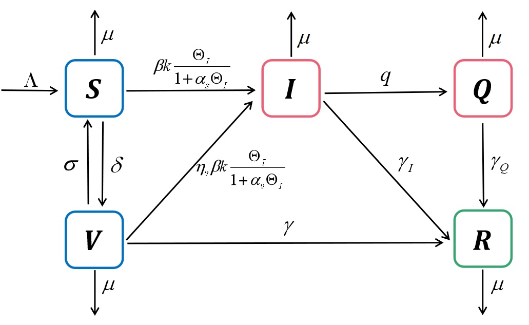 该研究针对易感个体与感染个体有效接触数达到饱和的现实情况,建立了基于复杂网络并采用饱和发生率的SVIQR传染病模型(流程图如下)。研究中成功计算了模型的基本再生数,并严格证明了无病平衡点与地方病平衡点的全局渐近稳定性。考虑到疫苗接种后免疫失效带来的传播不确定性,为有效控制疫情,研究创造性地设计了一种由G-布朗运动驱动的非周期性间歇性随机控制策略(示意图如下)。运用切比雪夫不等式和伊藤公式等随机理论工具,研究建立了模型几乎必然稳定的理论条件。