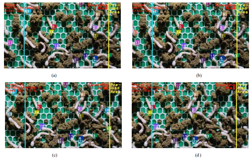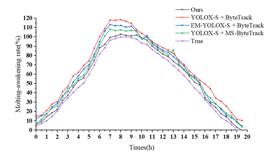 针对以上问题,团队提出了一种基于眠三角跟踪检测的小蚕眠起状态监测新方法。该方法基于优化的目标检测器实现小蚕眠三角目标的检测,在ByteTrack的基础上提出了重合检测框匹配法,解决了小蚕头部交错以及饲料遮挡导致检测框频繁切换的问题。同时,创新提出一种“检测线 ”法来解决由于小蚕活动而导致的重复计数问题,最终实现了小蚕眠起率的准确获取。使用该方法得到的眠起率趋势也与真实趋势保持高度一致。